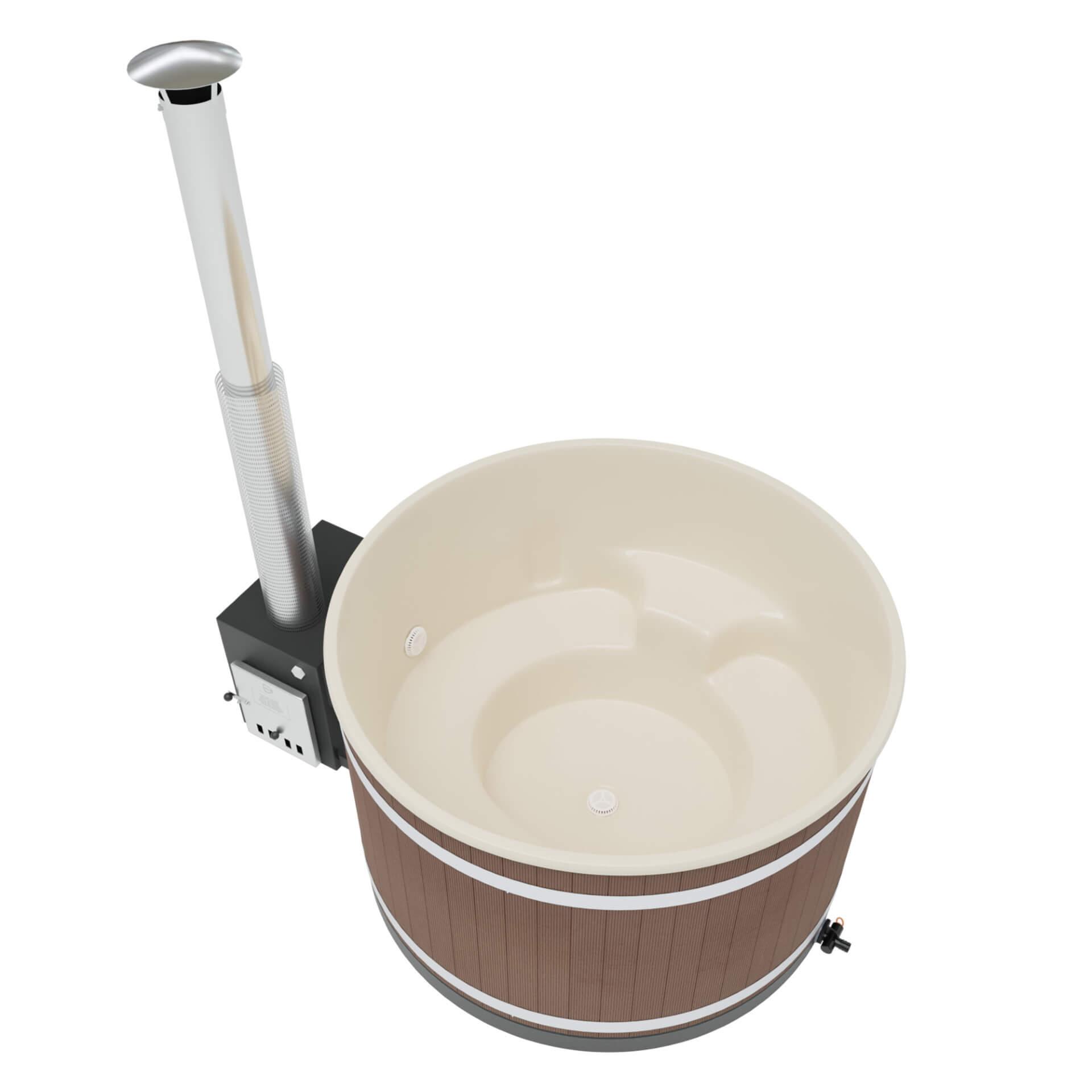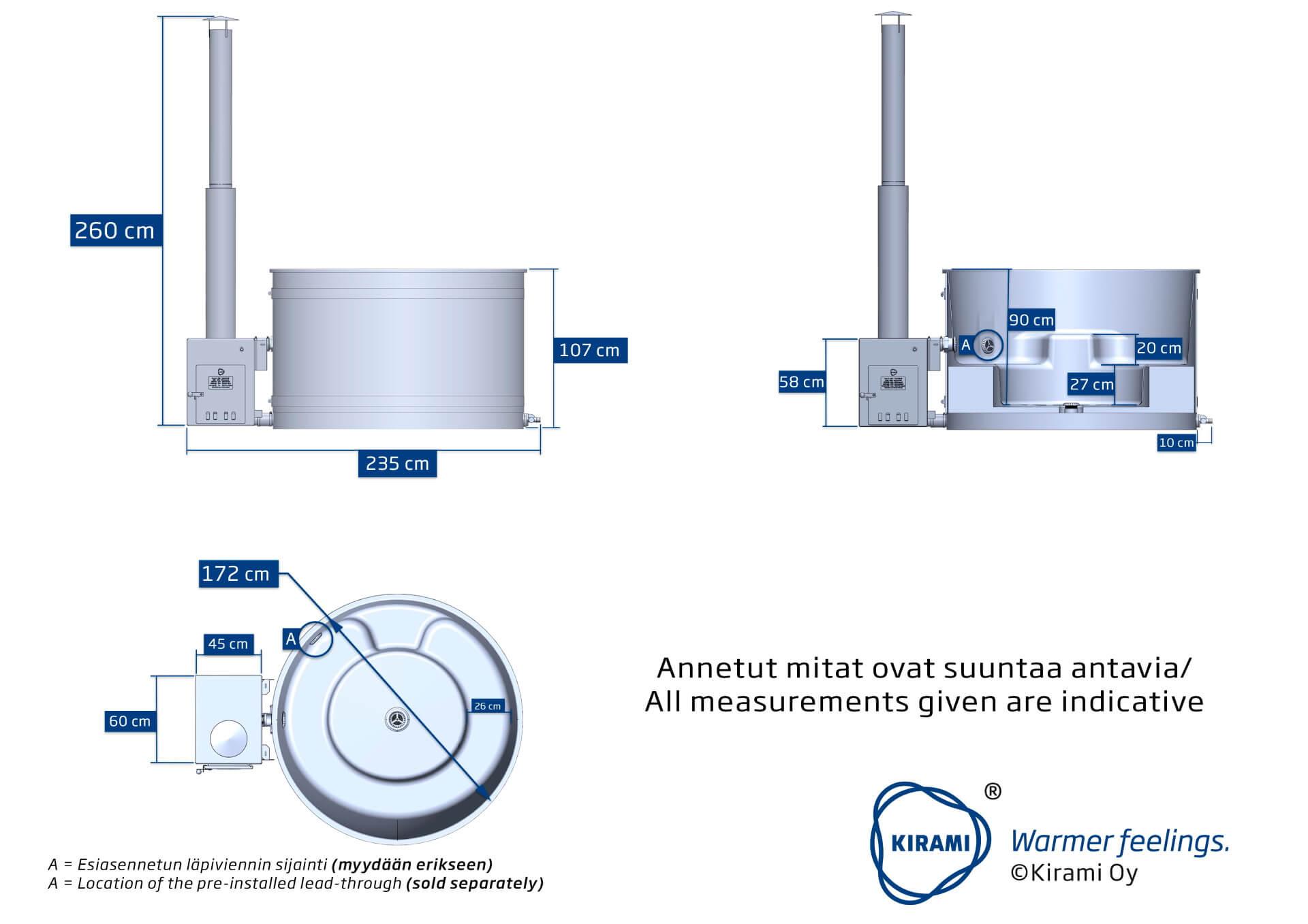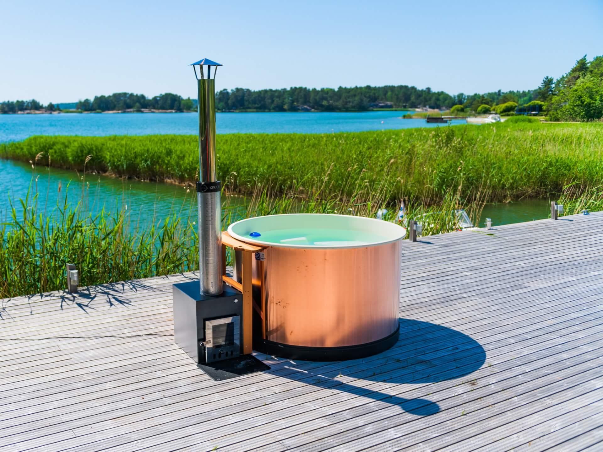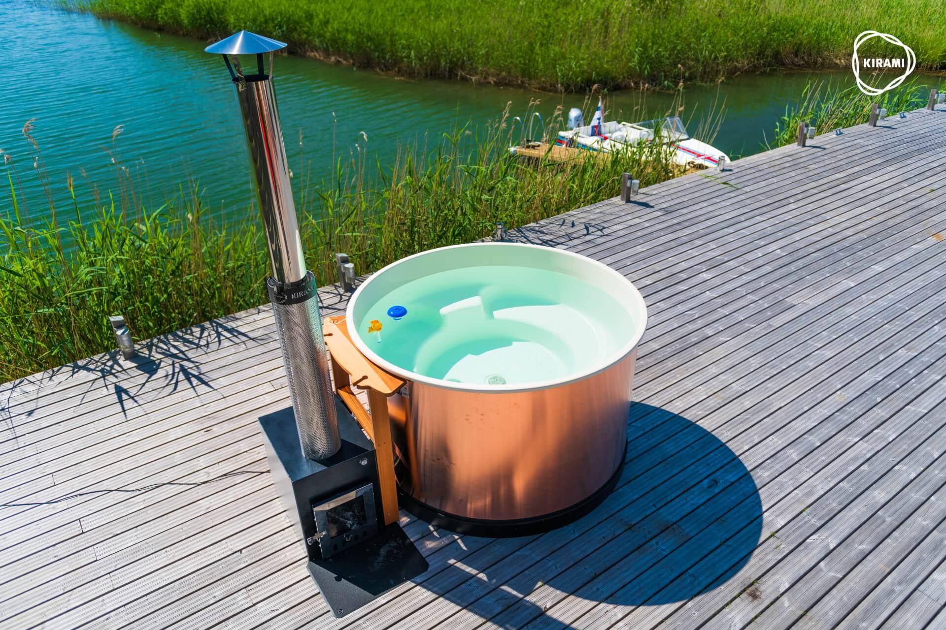 When placing the hot tub consider possible places to drain your bathing water too. If needed you can lead off the water with an outlet hose. The water discharge valve is located on the opposite side of the stove to which you can attach Kirami outlet hose. The hose has 38 mm inner diameter.
