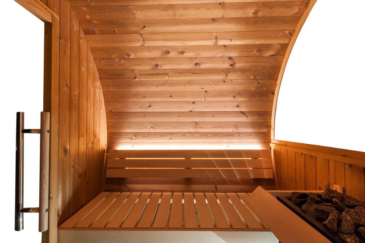 Two comfortable benches, ergonomic backrests, and a two-part floor grid ensure maximum seating comfort, while a dimmable LED strip, an elegant 8 mm tempered glass door, and black bitumen roof shingles add a modern touch. Designed for both electric and wood-burning stoves, this barrel sauna can also be optionally enhanced with an LED colour lighting set.