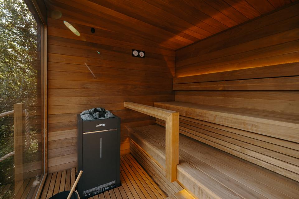 The benches made of heat-treated hardwood and the interior surfaces of the sauna are eye catching. The benches are easy to lift up for cleaning and maintenance. The large window gives the sauna a more spacious feel. The double glazed window made from grey, tempered, selective glass also improves the sauna’s energy efficiency, and the argon gas between the panes acts as an insulator. The panoramic window has a dark tint, which gives a wonderful balance and gentle feeling to the beautiful view.